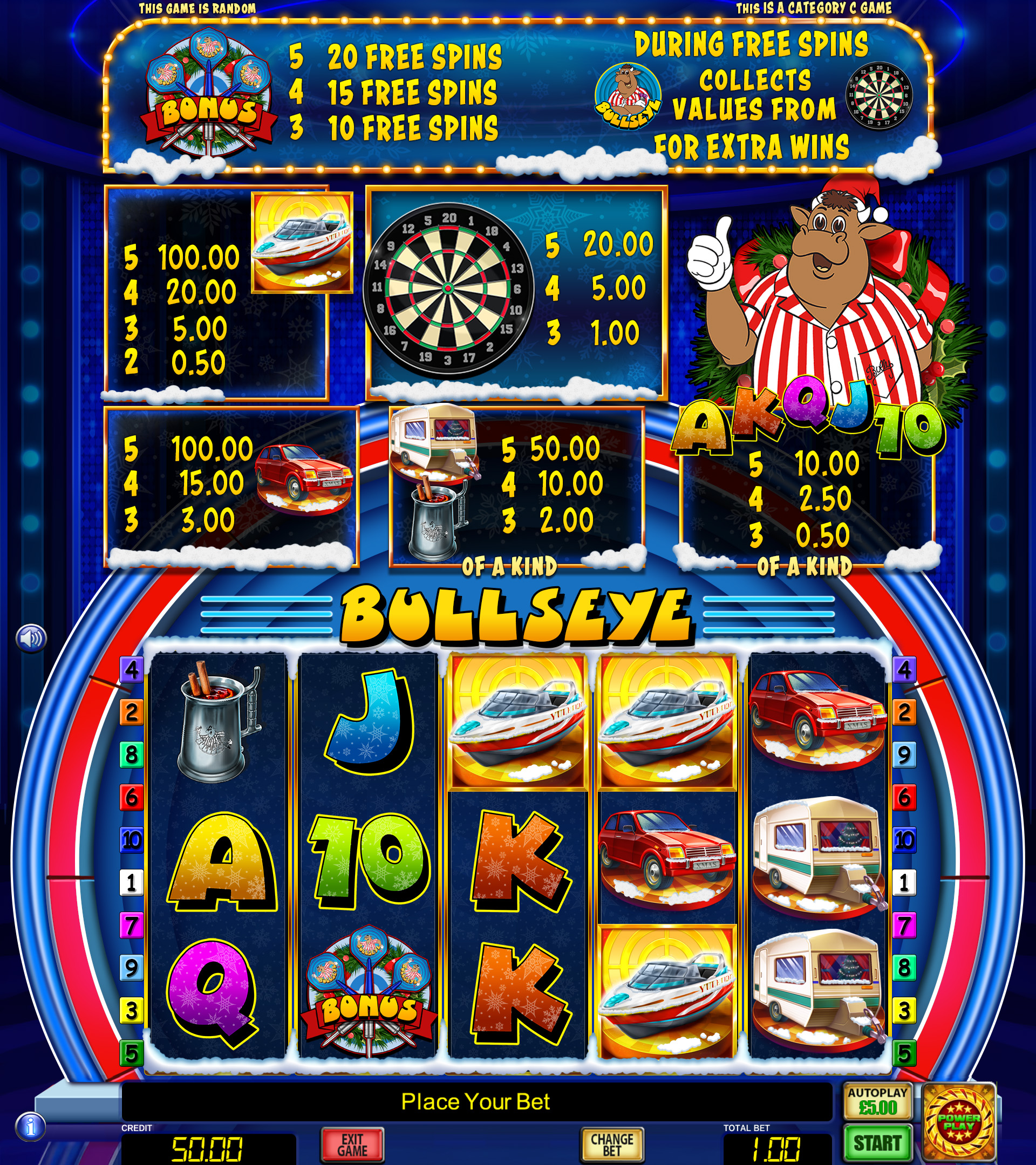 Free Spins Feature can be triggered by landing 3 or more scatter symbols or by the Pick a Dartboard Feature and can award up to 20 Free Spins. During Free Spins, Bully collects cash prizes from dartboards. If 4 Bully’s land on the reels during Free Spins, Golden Bully is activated and an extra 5 Free Spins are added. If a Golden Bully lands on the reels alongside at least 1 dartboard, Bully will throw 2 darts at the dartboard, increasing the cash value.